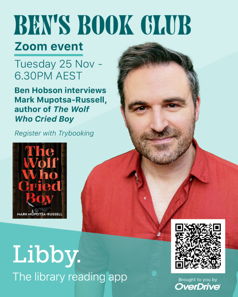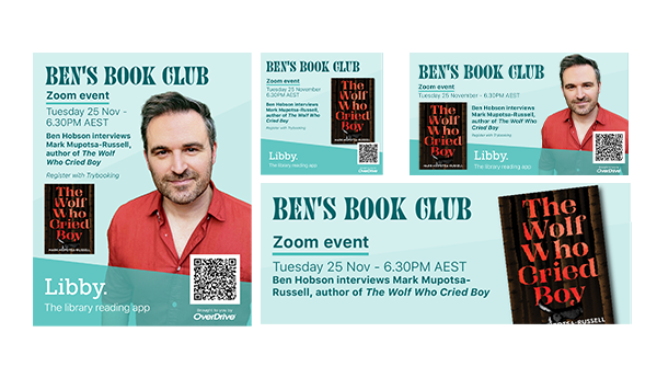 Ben’s Book Club is a monthly digital book club available exclusively to Australian and New Zealand libraries. In November, Ben Hobson will interview Mark Mupotsa-Russell, author of The Wolf Who Cried Boy on 25 November. Use these assets to promote the book club to your patrons.