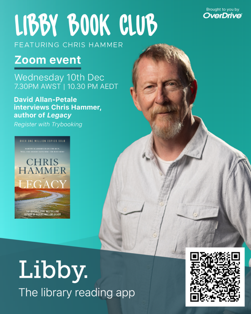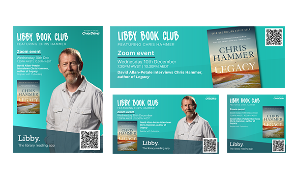 The Libby Book Club is a free monthly digital book club hosted by author David Allan-Petale. We welcome guests to join us the third Wednesday of each month to engage and interact with authors from all genres. November's book club features an interview with Chris Hammer, author of Legacy on 10 December. Use these assets to promote the book club to your patrons.