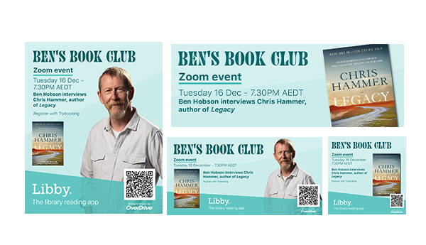 Ben’s Book Club is a monthly digital book club available exclusively to Australian and New Zealand libraries. In November, Ben Hobson will interview Chris Hammer, author of Legacy on 16 December. Use these assets to promote the book club to your patrons.