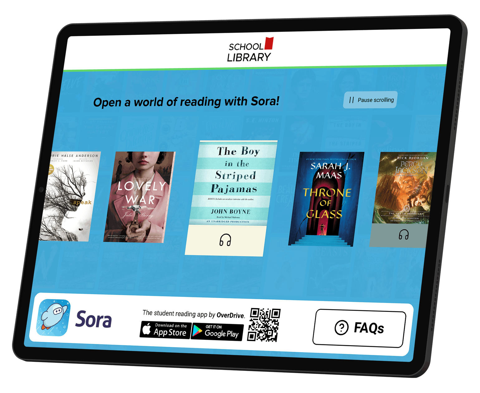 Sora Showcase scrolls through titles from your school’s curated collections. Students can interact with Showcase to view title details and read samples. They can also scan a QR code to go directly to Sora.