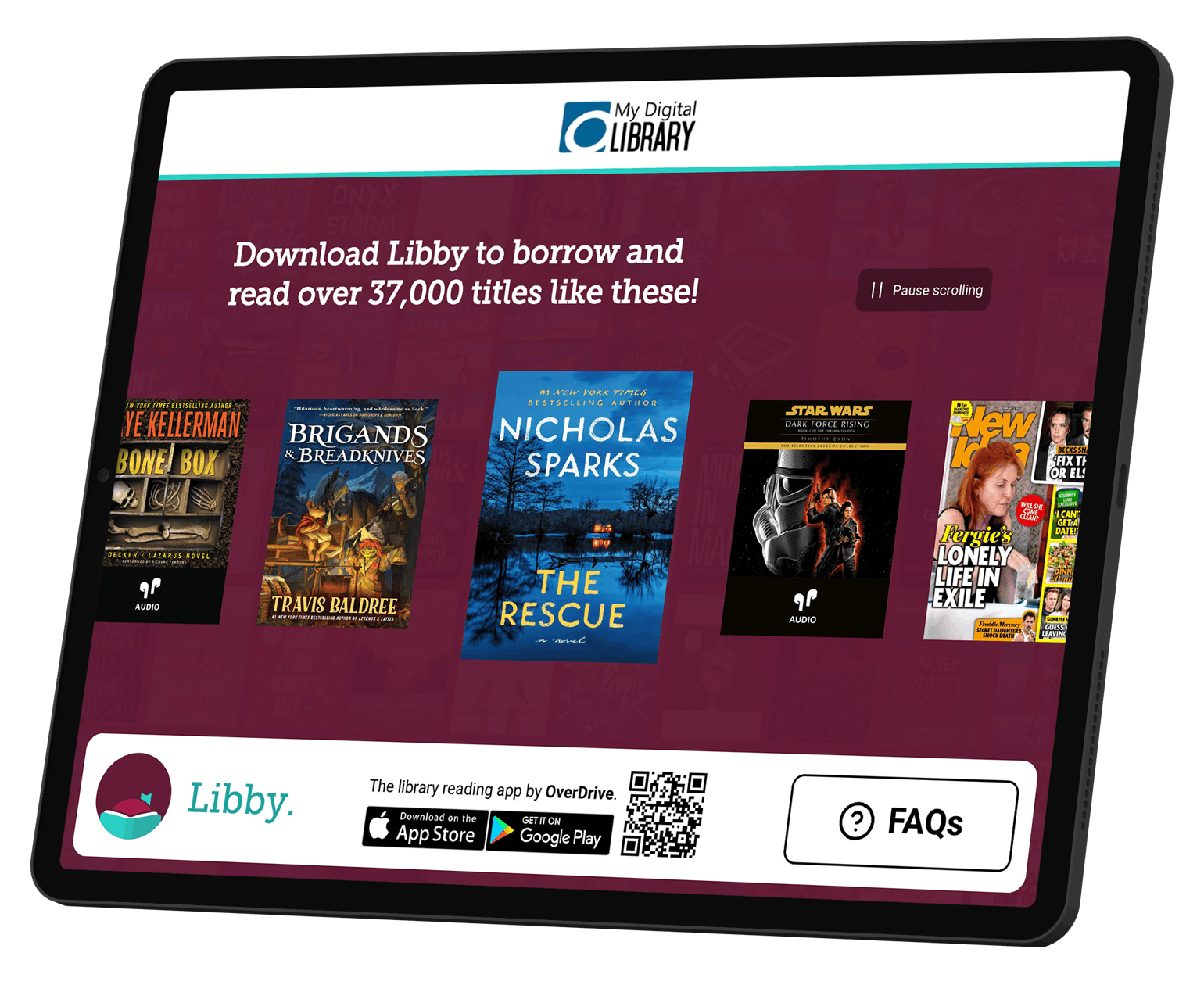 Libby Showcase scrolls through titles from your library’s curated lists. Patrons can interact with Showcase to view title details and read samples. They can also scan a QR code to download Libby.