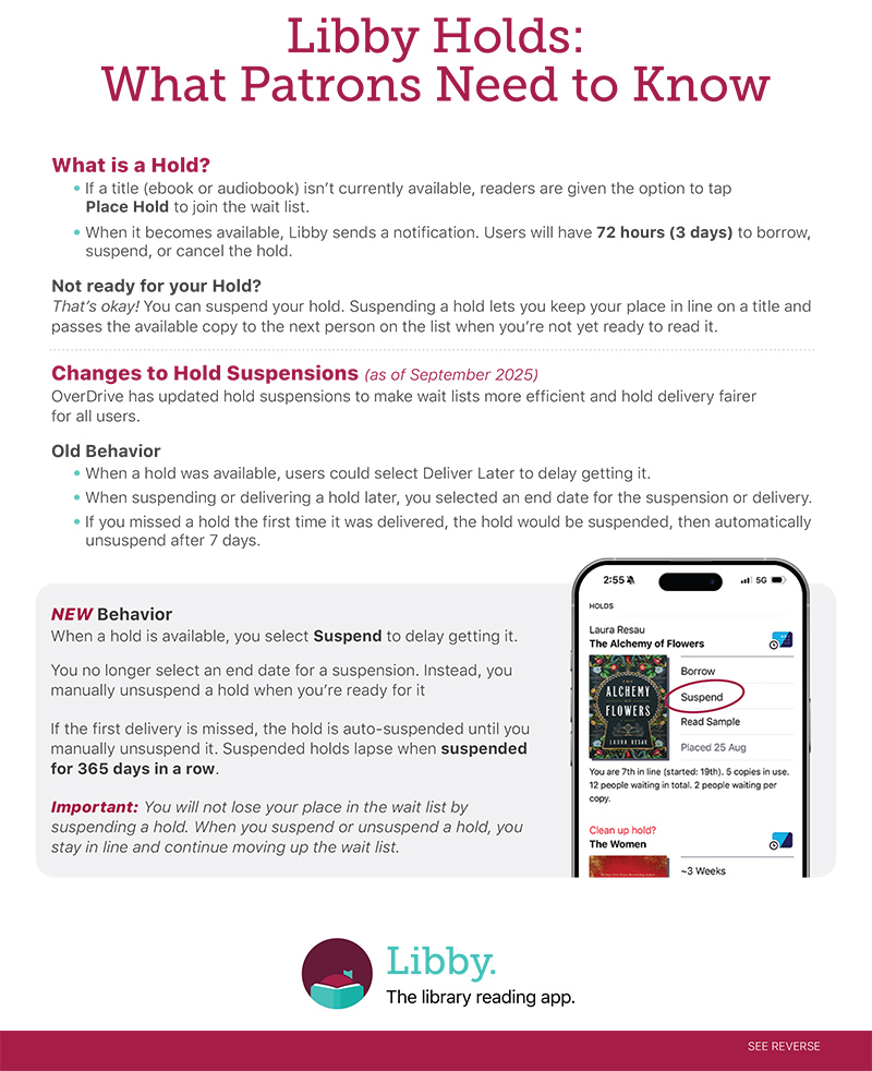 In September 2025, Libby by OverDrive updated its in-app holds management, the feature designed to allow readers to wait in line for a copy of their next read to become available from their library. This printable document covers frequently asked questions to help librarians answer any questions that they may get about this recent update.